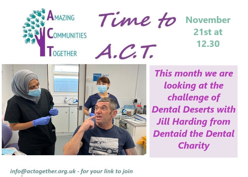 Many people are unable to access a dentist. This November join Amazing Communities Together to understand the challenge of Dental Deserts with Jill Harding from 'Dentaid'.