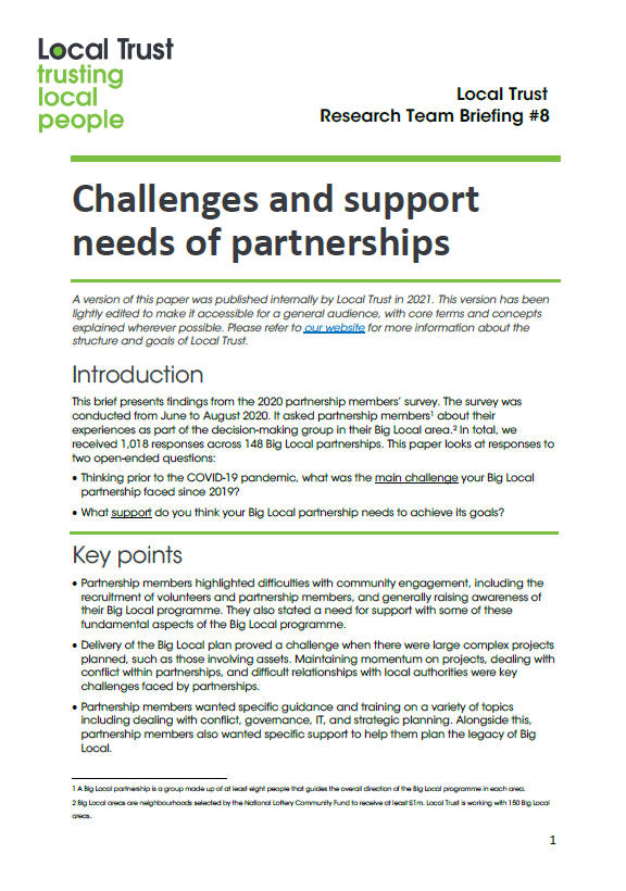 This brief is part of our Local Trust research papers series, originally shared internally with staff, and is one of four thematic briefs presenting findings from the 2020 partnership survey.