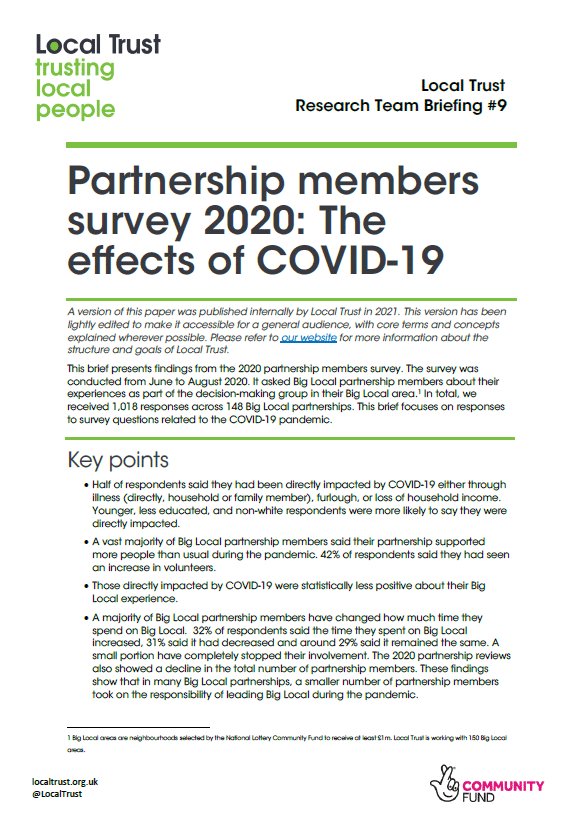 Every two years, Local Trust undertakes a comprehensive survey of all Big Local partnership members. This briefing focuses on responses to questions related to the COVID-19 pandemic. For example, half of respondents had been directly impacted by COVID-19 and the vast majority of Big Local partnership members said their partnership supported more people than usual during the pandemic.