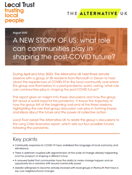 During April and May 2020, The Alternative UK held three remote sessions with a group of 30 residents from Plymouth in Devon to hear about the experiences of COVID-19 in the local community and ask where the group saw themselves in a post-pandemic world.