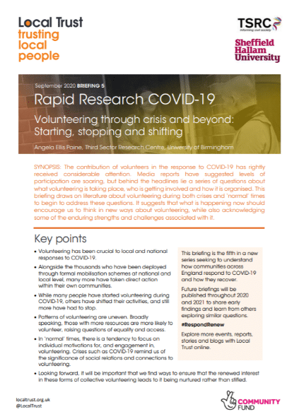 This is the fifth in our rapid research series on community responses to COVID-19 and how they recover. Further briefings will be published through 2020 and 2021 to share early findings and learn from others exploring similar questions.
