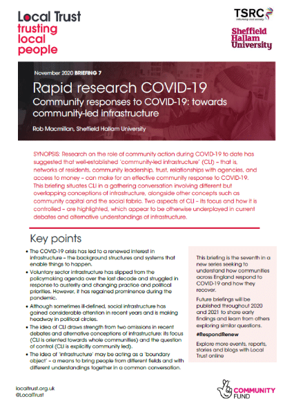 Research on the role of community action during COVID-19 to date has suggested that well-established ‘community-led infrastructure’ (CLI) – that is, networks of residents, community leadership, trust, relationships with agencies, and access to money – can make for an effective community response to COVID-19. This briefing situates CLI in a gathering conversation involving different but overlapping conceptions of infrastructure, alongside other concepts such as community capital and the social fabric. Two aspects of CLI – its focus and how it is controlled – are highlighted, which appear to be otherwise underplayed in current debates and alternative understandings of infrastructure.