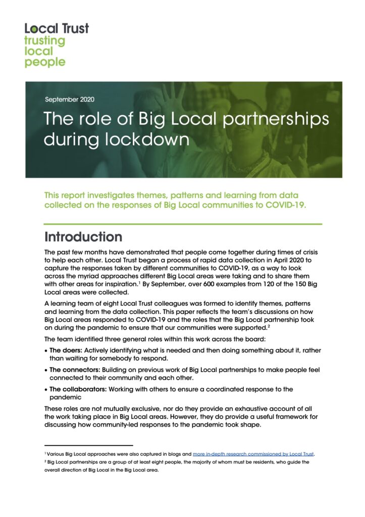 Local Trust began a process of rapid data collection in April 2020 to capture the responses taken by different communities to COVID-19, as a way to look across the myriad approaches Big Local areas were taking and to share them with other areas for inspiration. A learning team of eight Local Trust colleagues was formed to identify themes, patterns and learning from the data collection. This paper reflects the team’s discussions on how Big Local areas responded to COVID-19 and the roles that the partnership took on during the pandemic to ensure that our communities were supported.