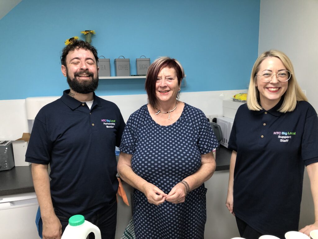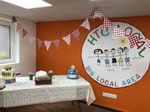 Photographers, council reps and local residents came together under a green marquee to watch as Ann – a small laughing woman sporting HTC’s navy shirt and dwarfed between the two men – described what the hub would mean to the community. Propped up by the pavement behind chequered red bunting and multicoloured balloons, Ann described it as her legacy and life’s work.