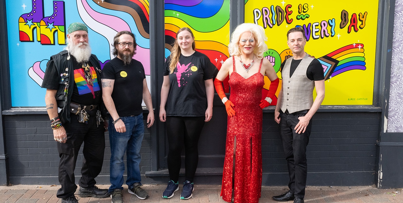 The above photograph shows the staff of The William Morris Bar who hosted a free drag and draw session as part of the William Morris Design Line 2022; they are situated in front of the aforementioned Aimee Capstick Vinyl window installation “Pride is Everyday”. Photo Credit: Alastair Fyfe